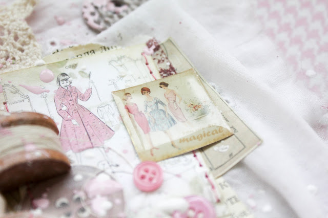 Выбрала следующие штампы: текстовый, манекен, ножницы и сантиметр. И дистресс чернилами двух оттенков (ANTIQUE LINEN, TEA DYE) проштамповала в нужных местах: